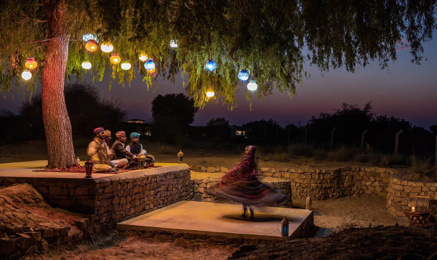 Every evening, our guests are welcomed to a mesmerizing Kalbeliya dance performance — the world-famous folk dance of Rajasthan known for its graceful movements, colorful attire, and hypnotic rhythm of traditional instruments.